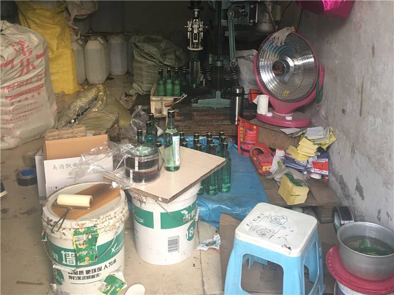 4月11日,環食藥旅中隊會同云崗派出所對群眾舉報的地點進行突擊檢查,發現已經灌好封箱的品牌白酒若干箱,還未灌裝的白酒盛在大塑料桶里,沒有任何衛生防護措施,塑料桶旁,空酒瓶、商標隨處可見。在現場,民警還起獲了用于生產假酒的封口機、打包機等設備。