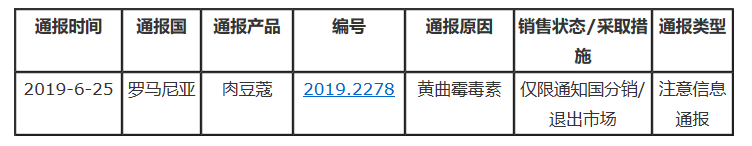 據歐盟食品和飼料快速預警系統(RASFF)消息,2019年6月25日,羅馬尼亞通過RASFF通報我國生產的肉豆蔻不合格。