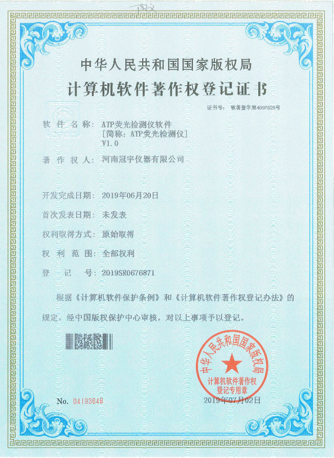 近日,河南冠宇儀器有限公司(以下簡(jiǎn)稱(chēng):冠宇儀器)繼之前的多項(xiàng)軟件著作權(quán)證書(shū)及專(zhuān)利證書(shū)之后,又獲由中華人民共和國(guó)國(guó)家版權(quán)局頒發(fā)的一項(xiàng)“ATP熒光檢測(cè)儀計(jì)算機(jī)軟件著作權(quán)登記證書(shū)”,一系列的權(quán)威肯定,彰顯了冠宇儀器強(qiáng)大的技術(shù)研發(fā)能力,也體現(xiàn)出公司為客戶(hù)提供優(yōu)質(zhì)產(chǎn)品的強(qiáng)大決心。