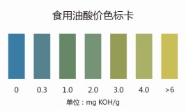1.1:取一條酸價檢測試紙浸入油樣中半秒鐘取出,5min后立即與標準色卡比較,找出與對照色卡上相近的色階即為食用油酸價的大致含量;
