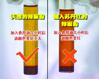 1.4:辣椒粉簡易測試蘇丹紅方法:可將辣椒粉放入試管中,加入食用油。顏色變化不大,則可認(rèn)為無添加蘇丹紅,若顏色變紅,則認(rèn)為可能添加蘇丹紅等油溶性非食用色素。
