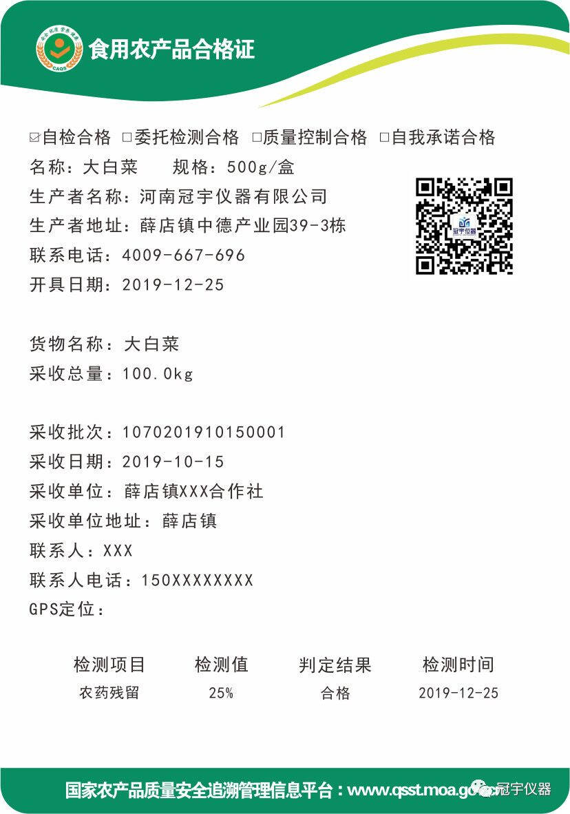 河南冠宇儀器有限公司可為各農業合作社建立二維碼追溯平臺,實現數據溯源和企業形象宣傳。目前冠宇儀器研發的食用農產品合格證農藥殘留檢測一體機GY-NC24A已正式進入市場,對全面推廣食用農產品合格證打印農藥殘留快速檢測制度將起到積極的作用。