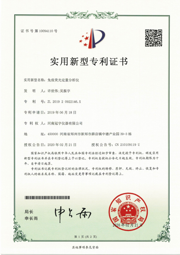 近日,河南冠宇儀器有限公司(以下簡稱:冠宇儀器)繼之前的多項軟件著作權證書及專利證書之后,又獲由中華人民共和國國家版權局頒發的一項“免疫熒光定量分析儀實用新型專利證書”,一系列的權威肯定,彰顯了冠宇儀器強大的技術研發能力,也體現出公司為客戶提供優質產品的強大決心。