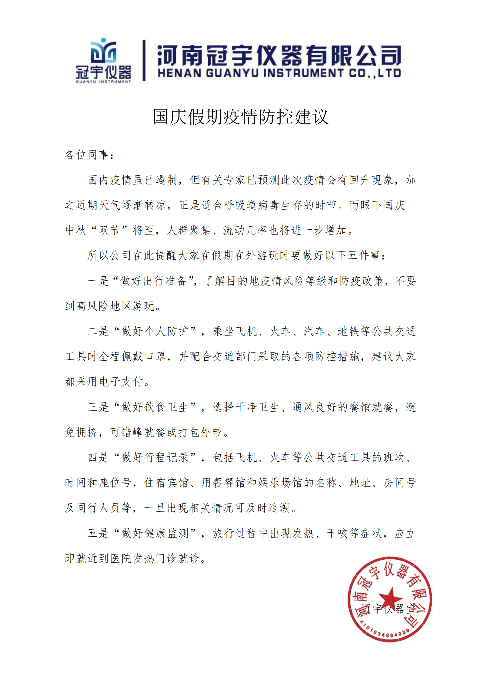 國慶長假即將臨近,冠宇儀器在這里提一些疫情防控建議希望能夠?qū)δ兴鶐椭?/span>
