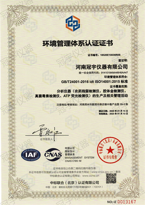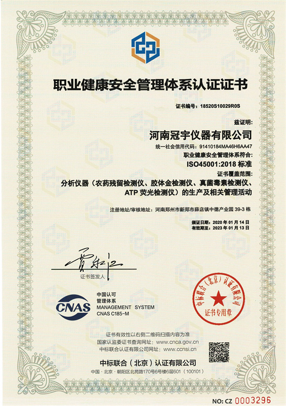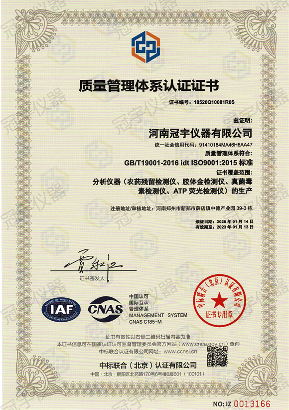 河南冠宇儀器有限公司(以下簡稱:冠宇儀器)繼之前的多項軟件著作權證書及專利證書之后,也獲得了ISO三體認證。