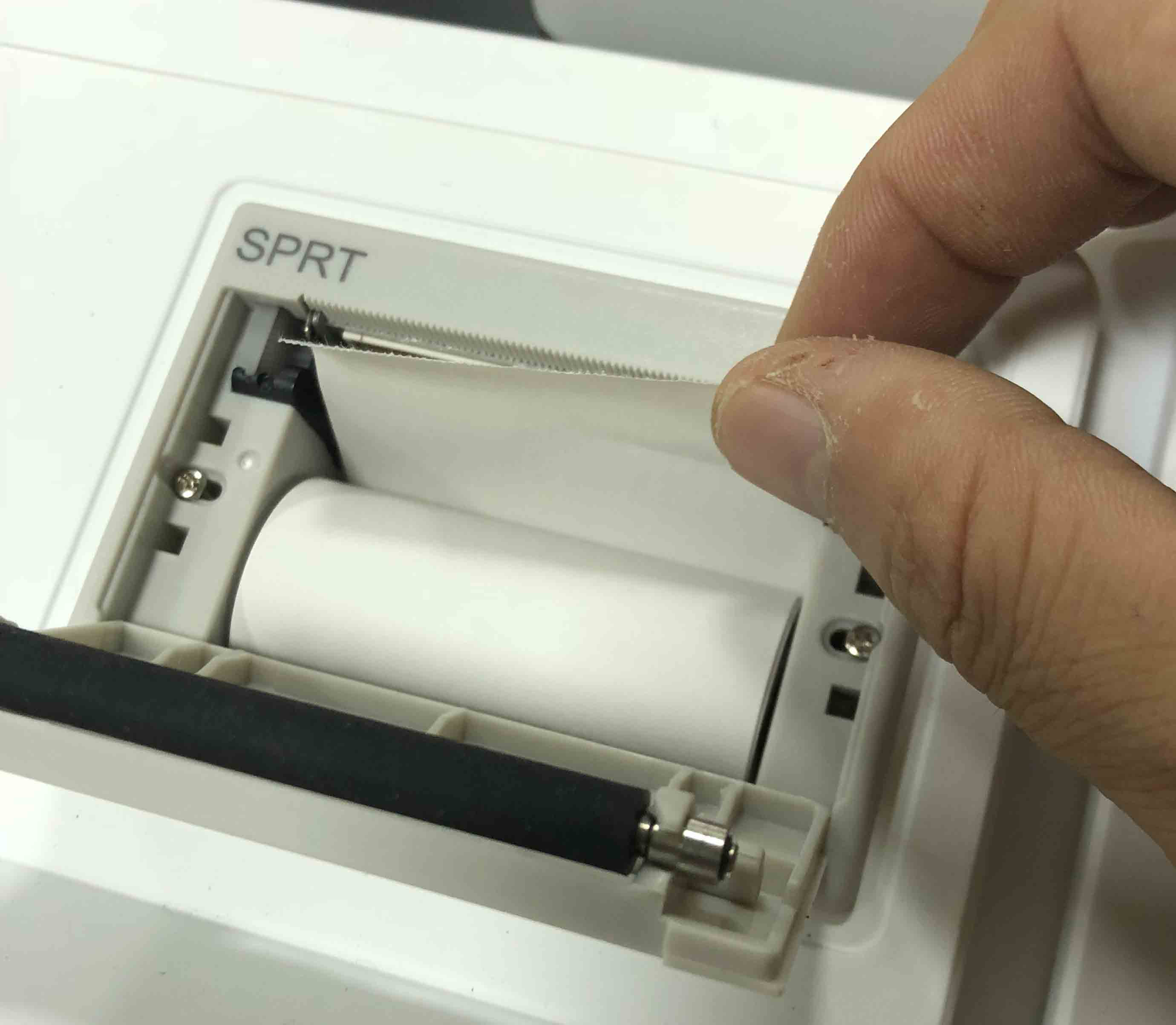 第二步:打印機(jī)紙盒中取出已用完的打印紙芯筒,裝入新的打印紙(注:打印紙有正反面),并將打印紙紙頭輕輕拉出一小段(以蓋上打印機(jī)面板后,打印紙能超出打印機(jī)的出紙口即可)。