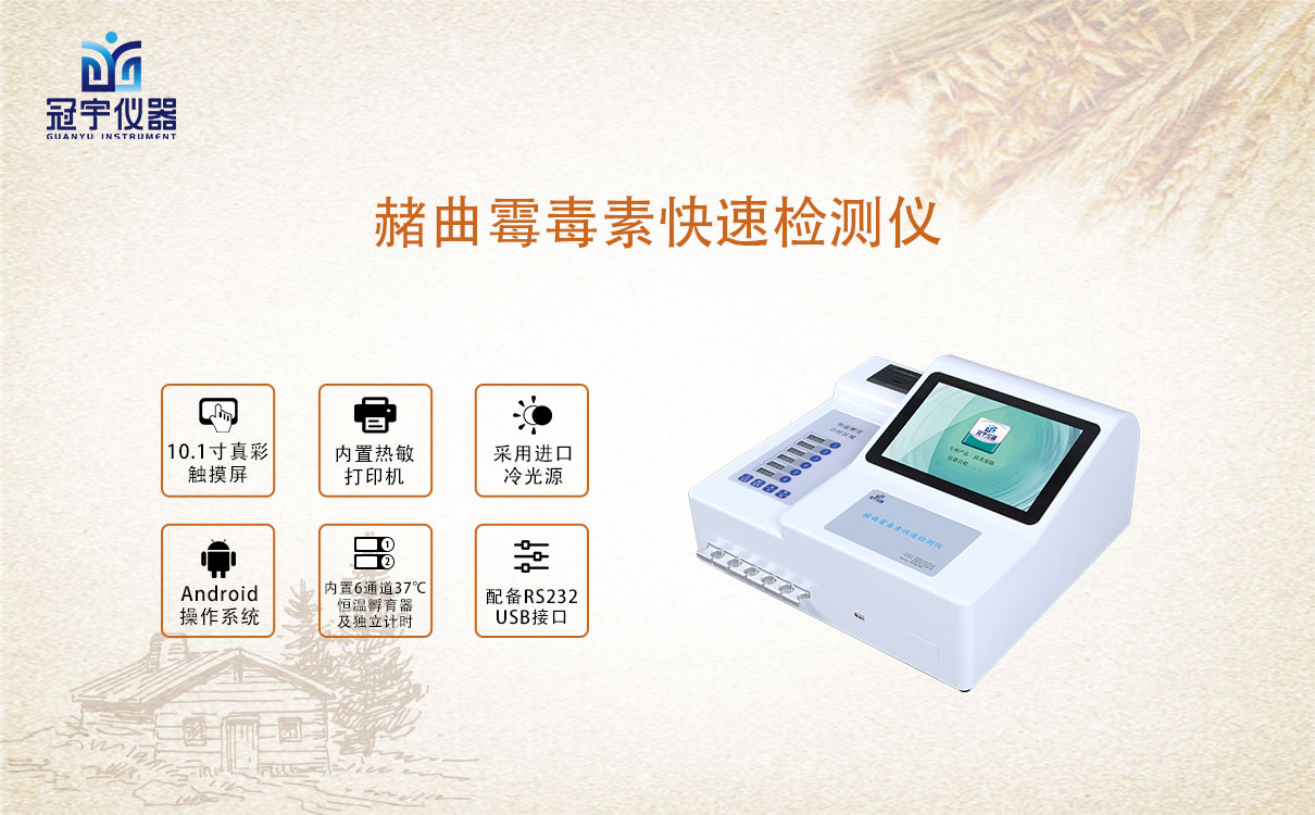 冠宇儀器真菌毒素檢測儀能夠快速定量檢測糧食、飼料、谷物、食用油、調味品等食品中T2毒素、嘔吐毒素、赭曲霉毒素、伏馬毒素、玉米赤霉烯酮,適用于糧油監測中心、糧油飼料生產加工、食品加工貿易、畜禽養殖戶自查、工商質監部門用于市場快速篩查等。杜絕赭曲霉毒素超標的糧食原料及食品流入市場。造成危害。