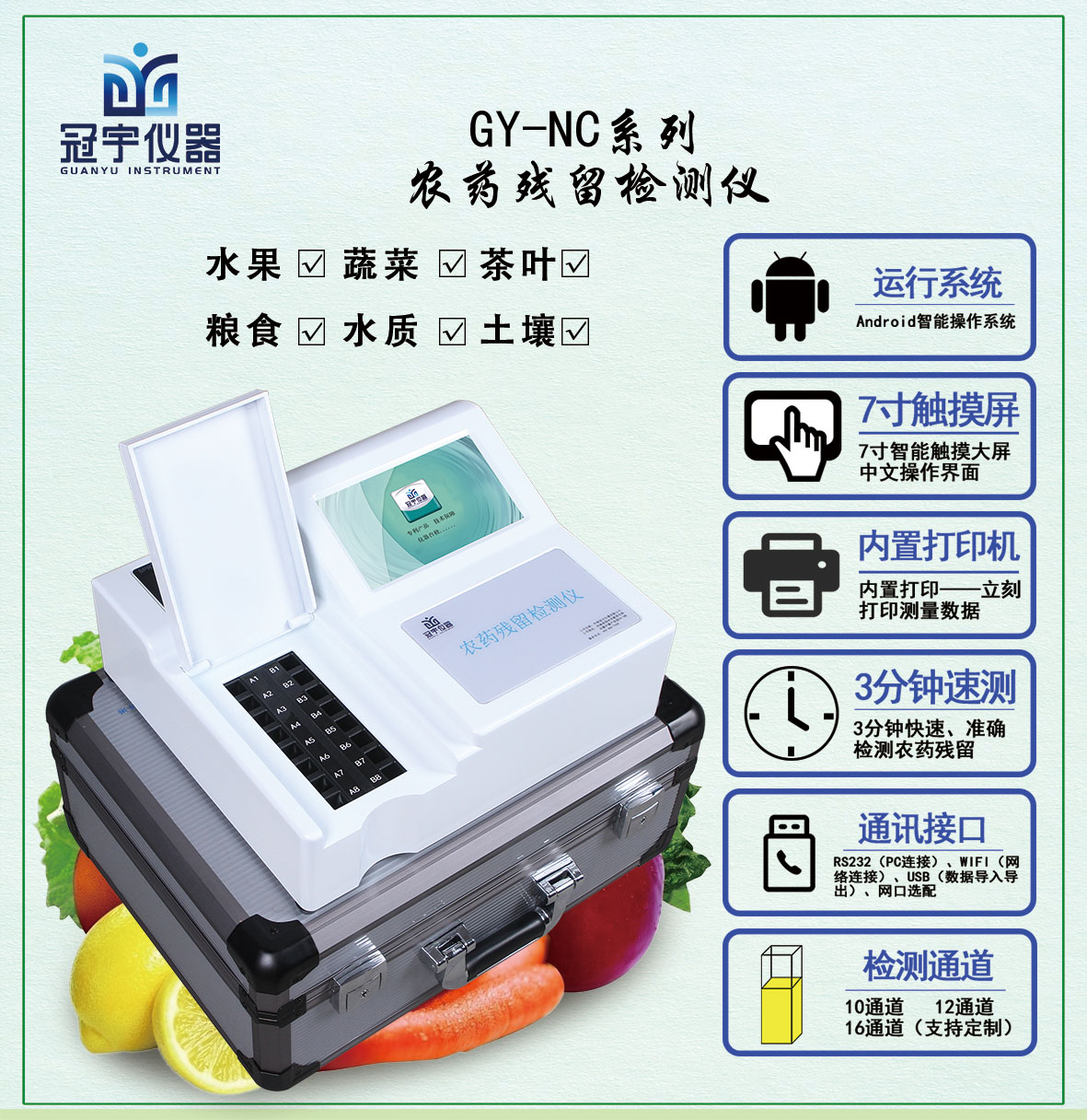 河南冠宇儀器有限公司生產的新一代智能型農藥殘留檢測儀;是根據農業標準方法(NY/T 448-2001)和國家標準(GB/T5009.199-2003)中的酶抑制率法,嚴格遵循《GB/T5009.199-2003蔬菜中有機磷和氨基甲酸酯類農藥殘留快速檢測方法標準》中的規定對蔬菜中有機磷和氨基甲酸酯類農藥殘留的快速檢測。