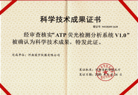 河南冠宇儀器有限公司(以下簡稱:冠宇儀器)繼多項軟件著作權(quán)證書、實用新型專利證書、計算機軟件著作權(quán)等一系列證書之后,又獲由河南省科學(xué)技術(shù)廳頒發(fā)的一項“ATP熒光檢測分析系統(tǒng)V1.0科學(xué)技術(shù)成果證書”,一系列的權(quán)威肯定,彰顯了冠宇儀器強大的技術(shù)研發(fā)能力,也體現(xiàn)出公司為客戶提供優(yōu)質(zhì)產(chǎn)品的強大決心。