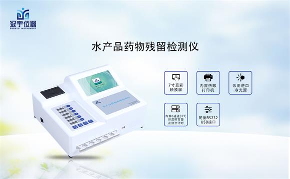 水產品藥物殘留快速檢測實驗方案運用儀器:河南冠宇儀器有限公司專業的水產品藥物殘留檢測儀,應用競爭抑制免疫層析的原理,通過檢測線熒光定量卡中的熒光強弱程度,定量分析水產品中孔雀石綠、氯霉素、硝基呋喃類:呋喃唑酮(AOZ)、呋喃它酮( AMOZ )、呋喃妥因(AHD)、呋喃西林(SEM)、呋喃那斯、磺胺類、激素類、四環素類、金霉素、土霉素、甲砜霉素、氟苯尼考、喹諾酮類藥物:噁喹酸、諾氟沙星、恩諾沙星、環丙沙星、氧氟沙星等多種殘留含量。