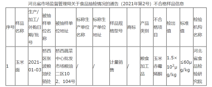 不合格樣品為:橋西區(qū)張波糧油經(jīng)銷處銷售的玉米面檢出玉米赤霉烯酮不符合食品安全國家標準規(guī)定。
