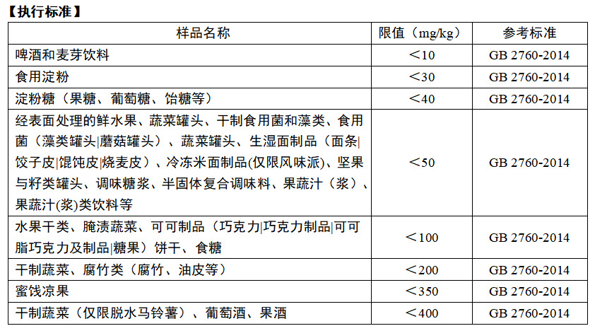 為保證消費者健康,我國在食品添加劑標(biāo)準(zhǔn)中規(guī)定了二氧化硫類物質(zhì)在食品中的使用范圍、使用量及允許最大殘留量。