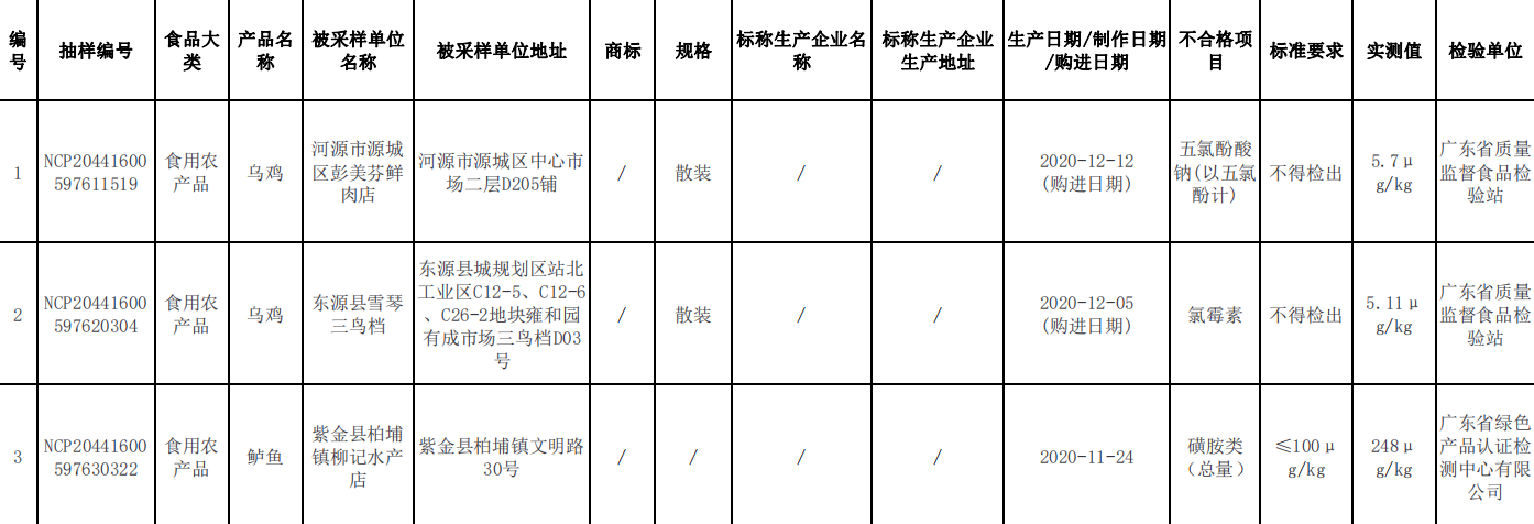 近期,河源市市場監督管理局組織監督抽檢共計抽檢169批,含茶葉及相關制品、炒貨食品及堅果制品、酒類、糧食加工品、食鹽、食用農產品、食用油、油脂及其制品、糖果制品、飲料等9類食品169批樣品、不合格3批,其中2批次涉及獸藥殘留問題比較突出。根據食品安全國家標準,個別項目不合格,其產品即判定為不合格產品。