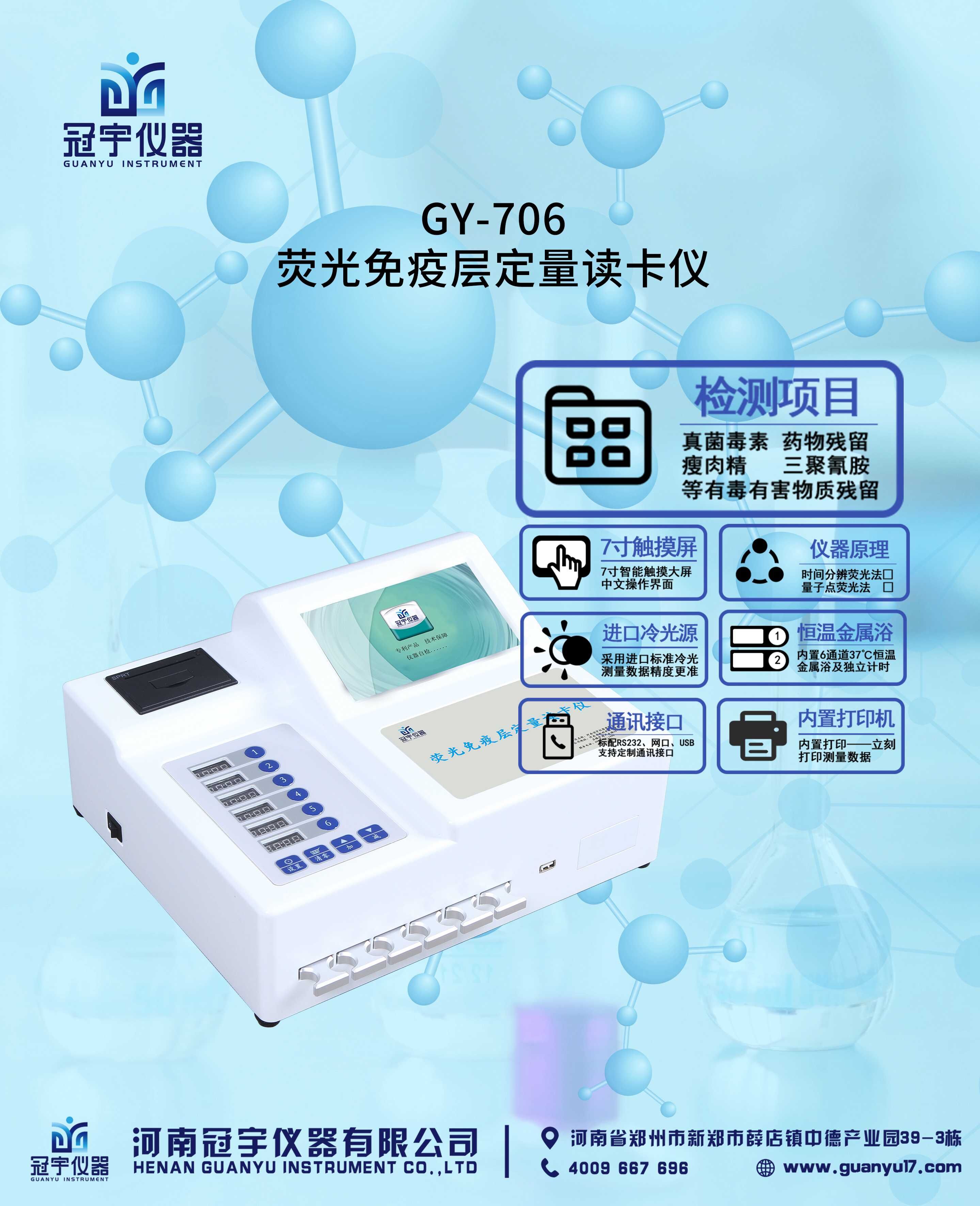 量子點(diǎn)熒光定量分析儀GY-706量子點(diǎn)熒光定量分儀應(yīng)用競爭抑制免疫層析的原理,通過檢測線熒光定量卡中的熒光強(qiáng)弱程度,定量分析量子點(diǎn)熒光法制成的真菌毒素、獸藥、瘦肉精、抗生素、動物疫病、農(nóng)藥殘留、臨床檢查項目、等有毒有害物質(zhì)殘留