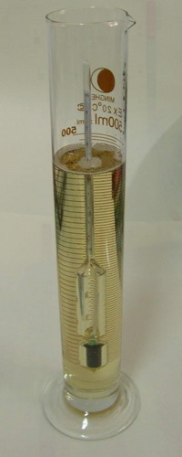 1.1:將蜂蜜輕輕混勻,再輕輕倒入250mL量筒中(取樣量約300mL),將潔凈干燥的蜂蜜比重計(波美計)輕 輕插入蜂蜜中央,任其自然下沉(下沉時間不少于15min)至不再下沉為止,水平觀察,按蜂蜜彎月面的上緣取讀數(shù),同時用溫度計測定蜂蜜溫度。