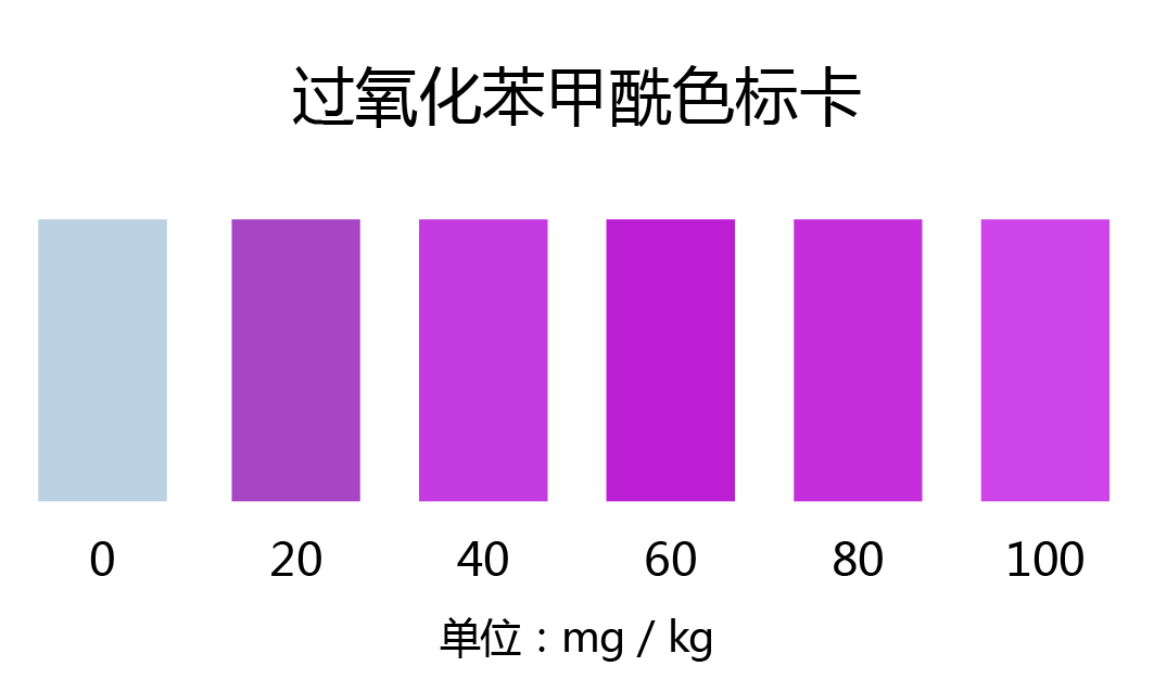 1.3:顯色10min后立即與比色卡對照,找出相應的含量。如顏色有變紅則說明可能摻有過氧化苯甲酰,顏色越深,含量越高。
