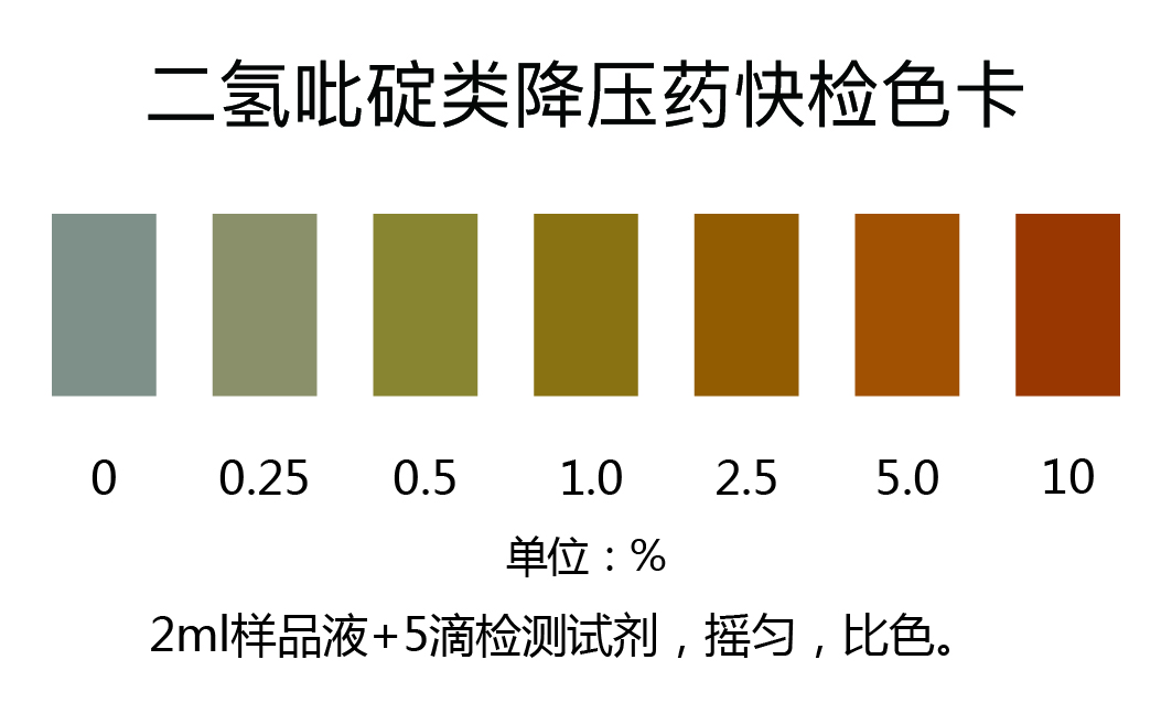 取上述濾液2ml于試管中,加入5滴檢測液,振蕩混勻,對照色卡比色,二氫吡啶類降壓藥含量越高,顏色越深;