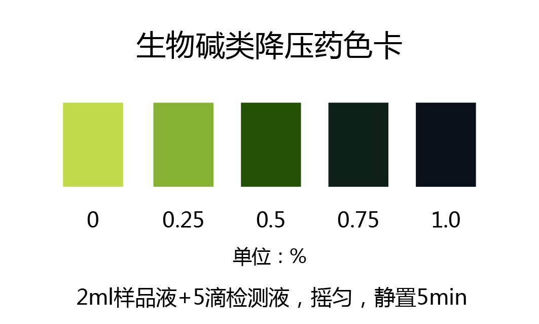取上述濾液2ml于玻璃比色皿或試管中,加入5滴檢測液,振蕩混勻,靜置5min,對照色卡比色,生物堿類降壓藥含量越高,顏色越深;